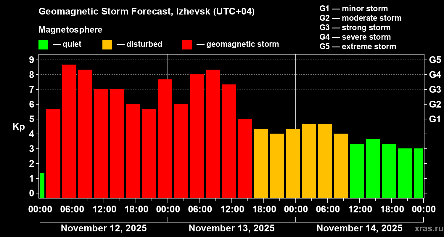 Geomagnetic storm forecast in Izhevsk for Nov 12, 2025