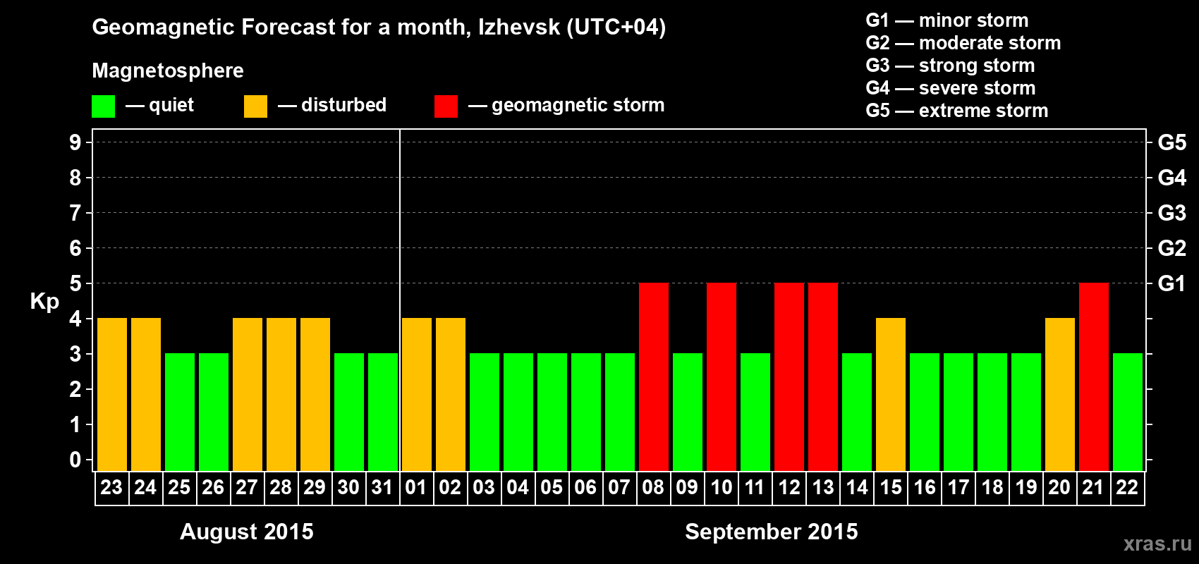 Geomagnetic storm forecast in Izhevsk for Aug 23, 2015