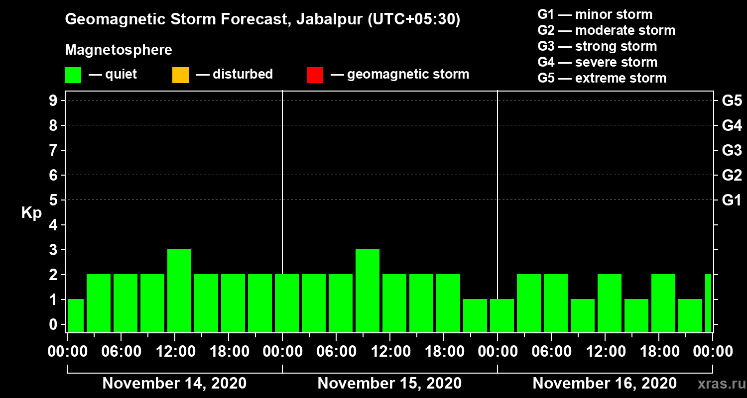 Geomagnetic storm forecast in Jabalpur for Nov 14, 2020