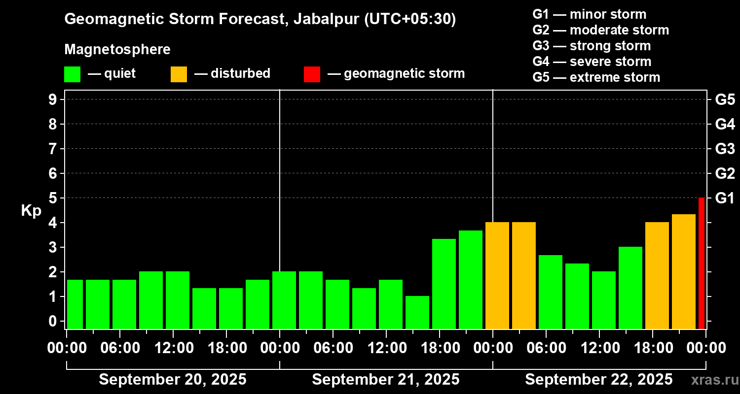 Geomagnetic storm forecast in Jabalpur for Sep 20, 2025