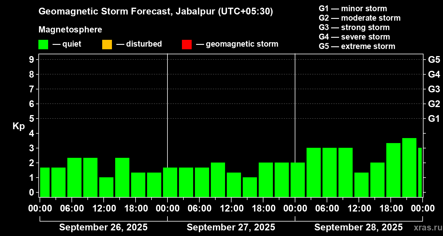 Geomagnetic storm forecast in Jabalpur for Sep 26, 2025