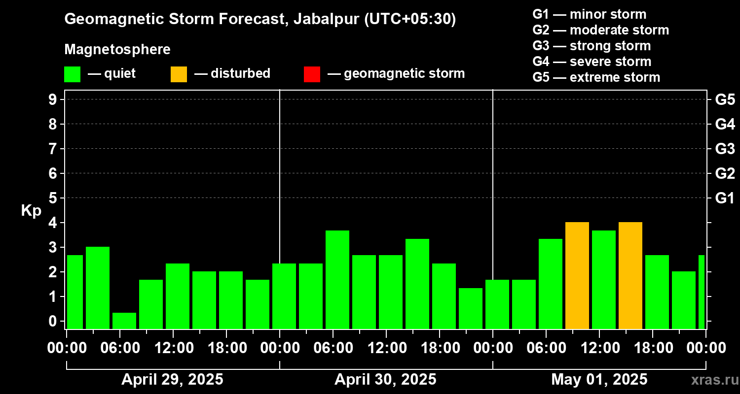 Geomagnetic storm forecast in Jabalpur for Apr 29, 2025