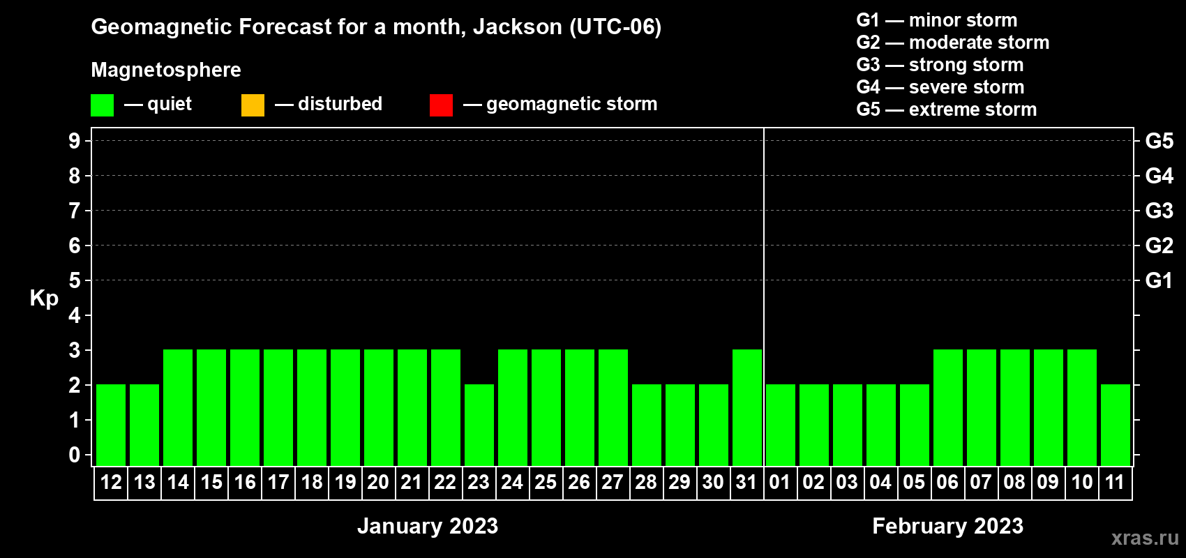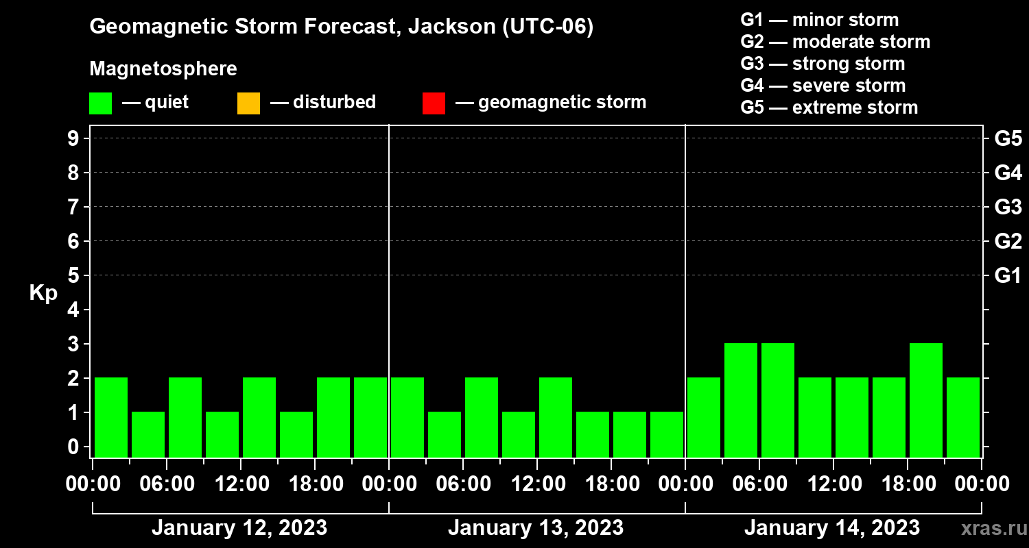 Geomagnetic storm forecast in Jackson for Jan 12, 2023