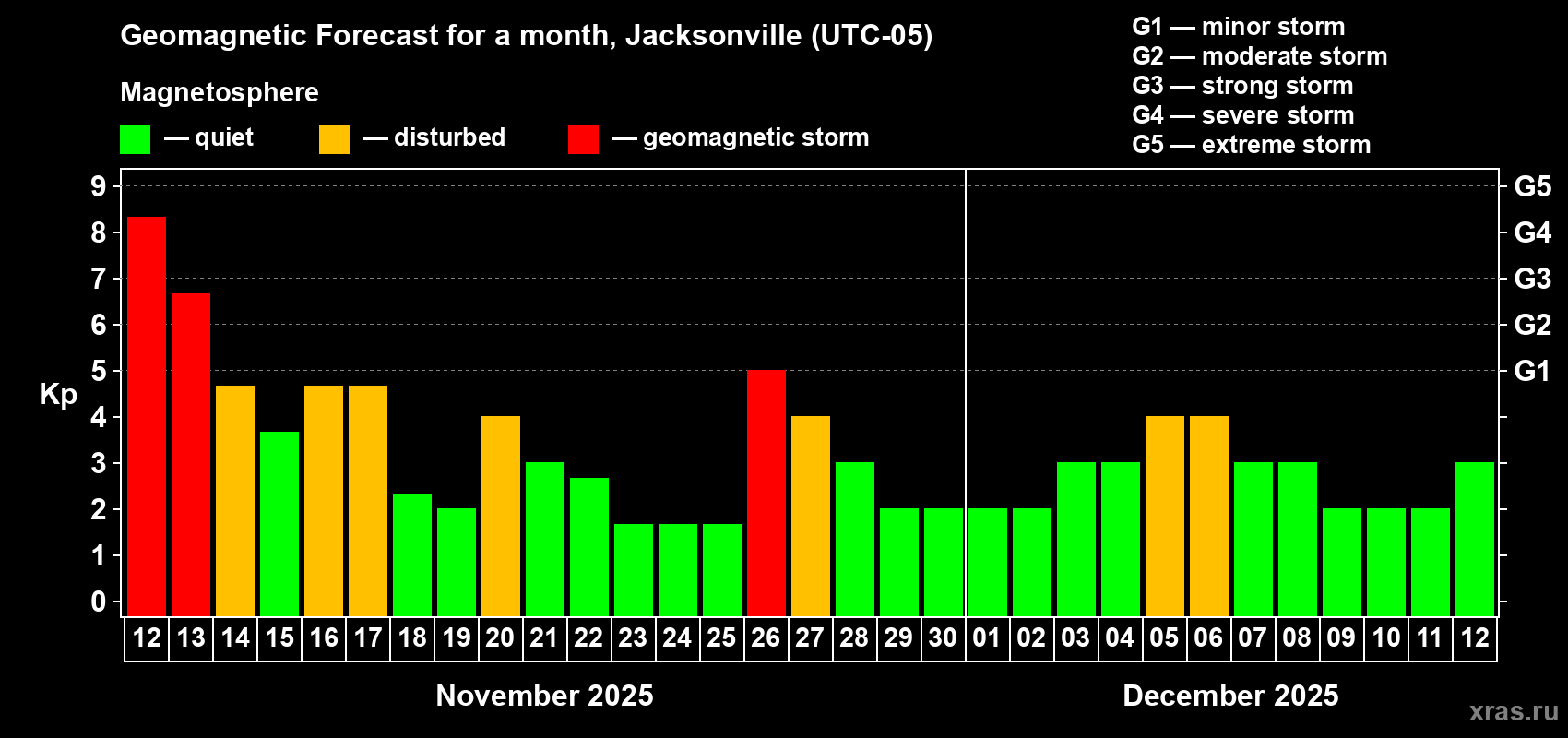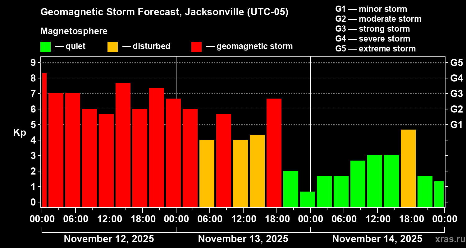 Geomagnetic storm forecast in Jacksonville for Nov 12, 2025