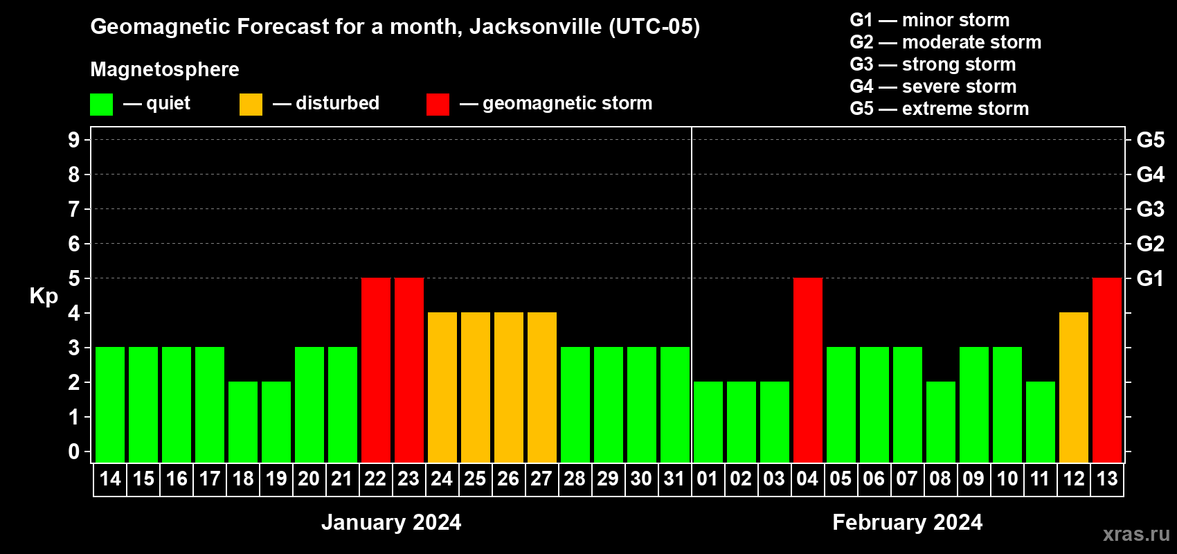 Geomagnetic storm forecast in Jacksonville for Jan 14, 2024