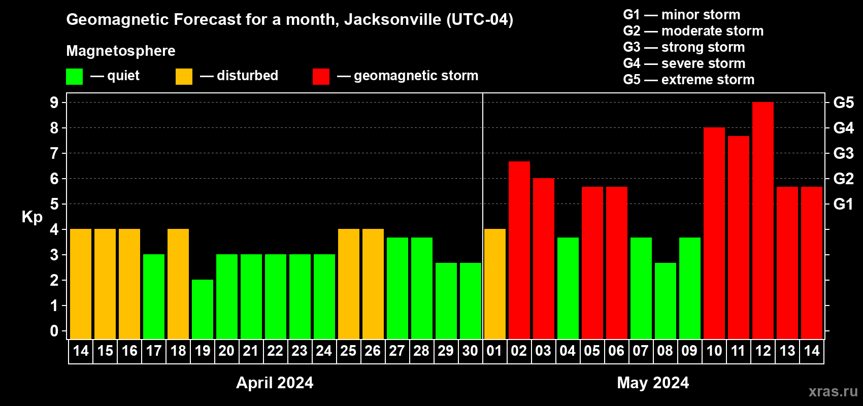 Geomagnetic storm forecast in Jacksonville for Apr 14, 2024