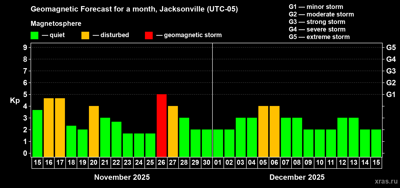 Geomagnetic storm forecast in Jacksonville for Nov 15, 2025