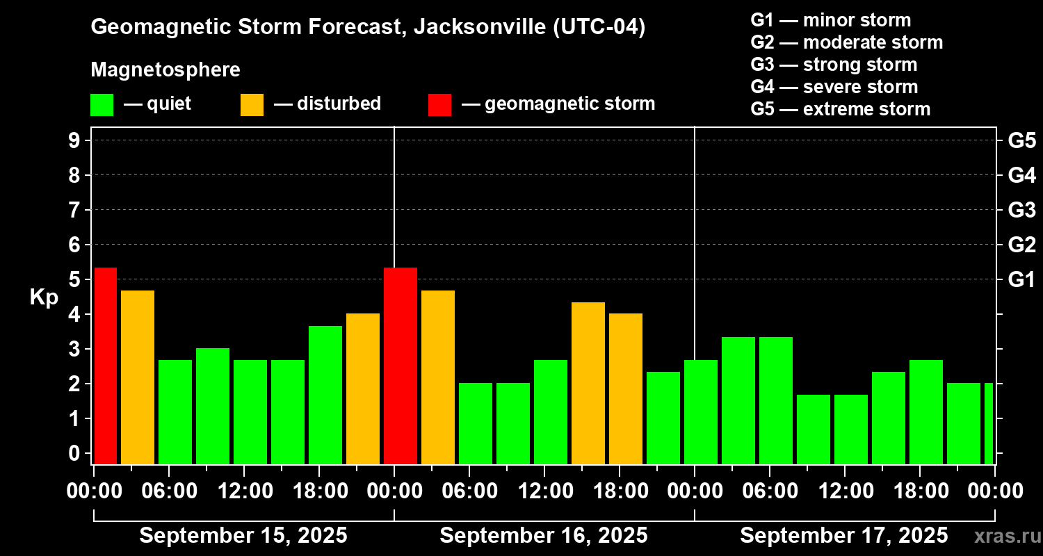 Geomagnetic storm forecast in Jacksonville for Sep 15, 2025