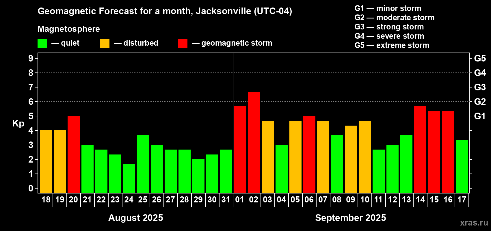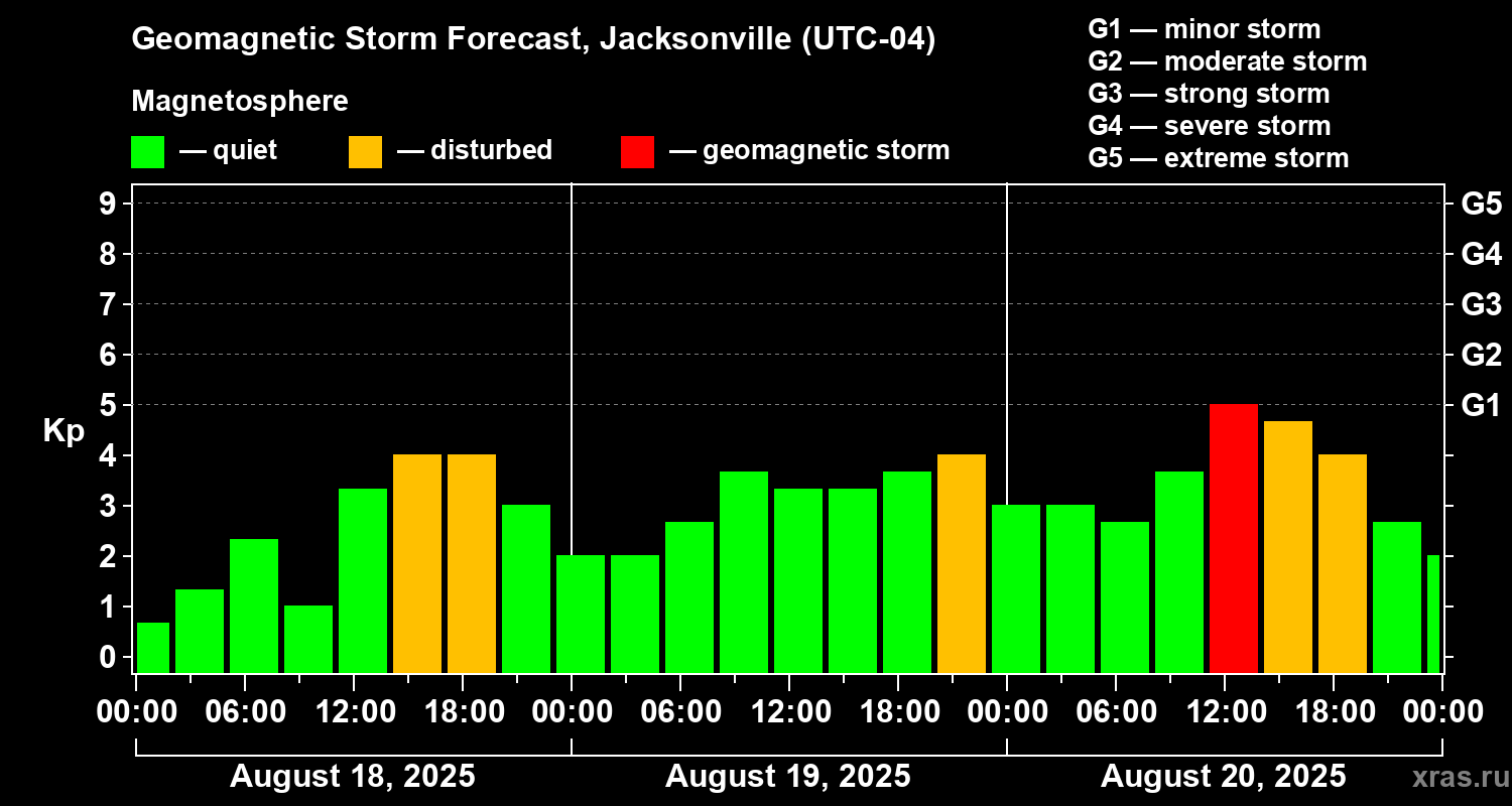 Geomagnetic storm forecast in Jacksonville for Aug 18, 2025