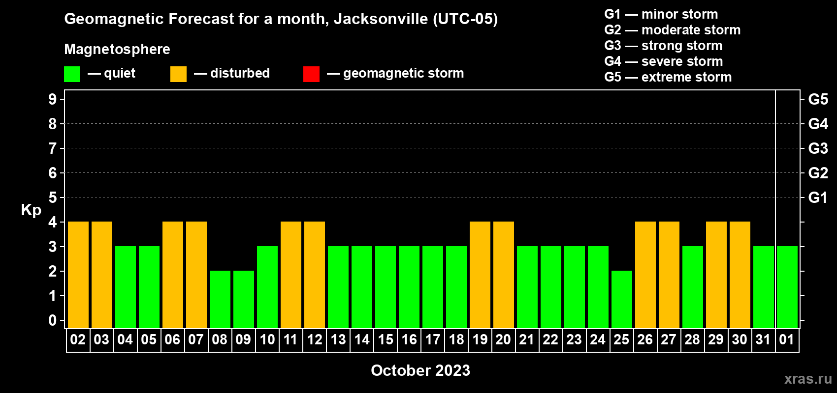 Geomagnetic storm forecast in Jacksonville for Oct 02, 2023