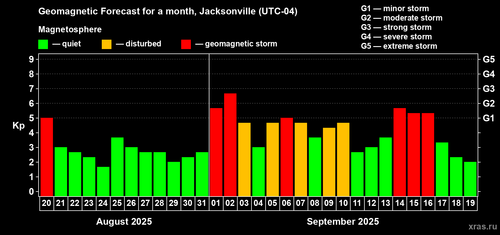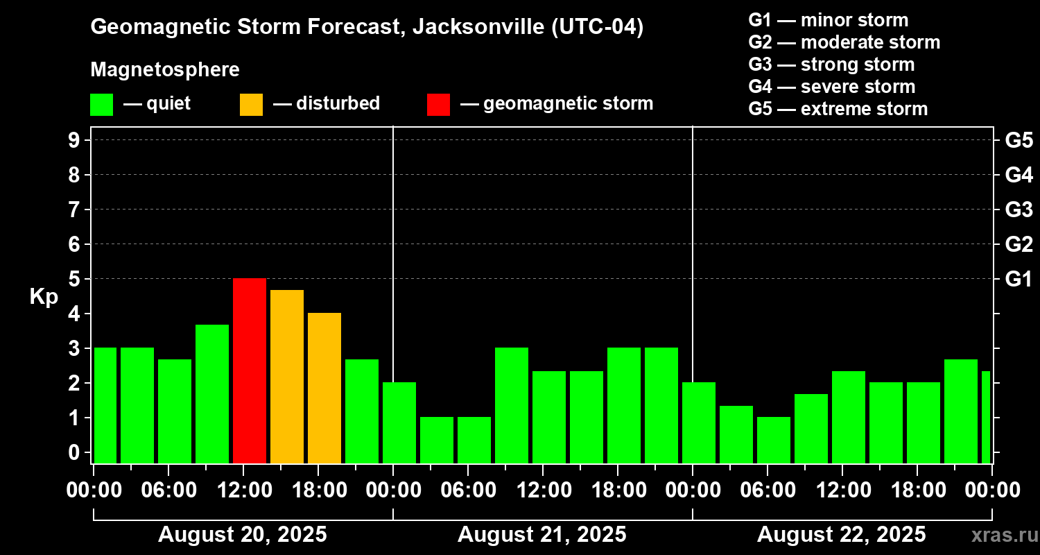 Geomagnetic storm forecast in Jacksonville for Aug 20, 2025