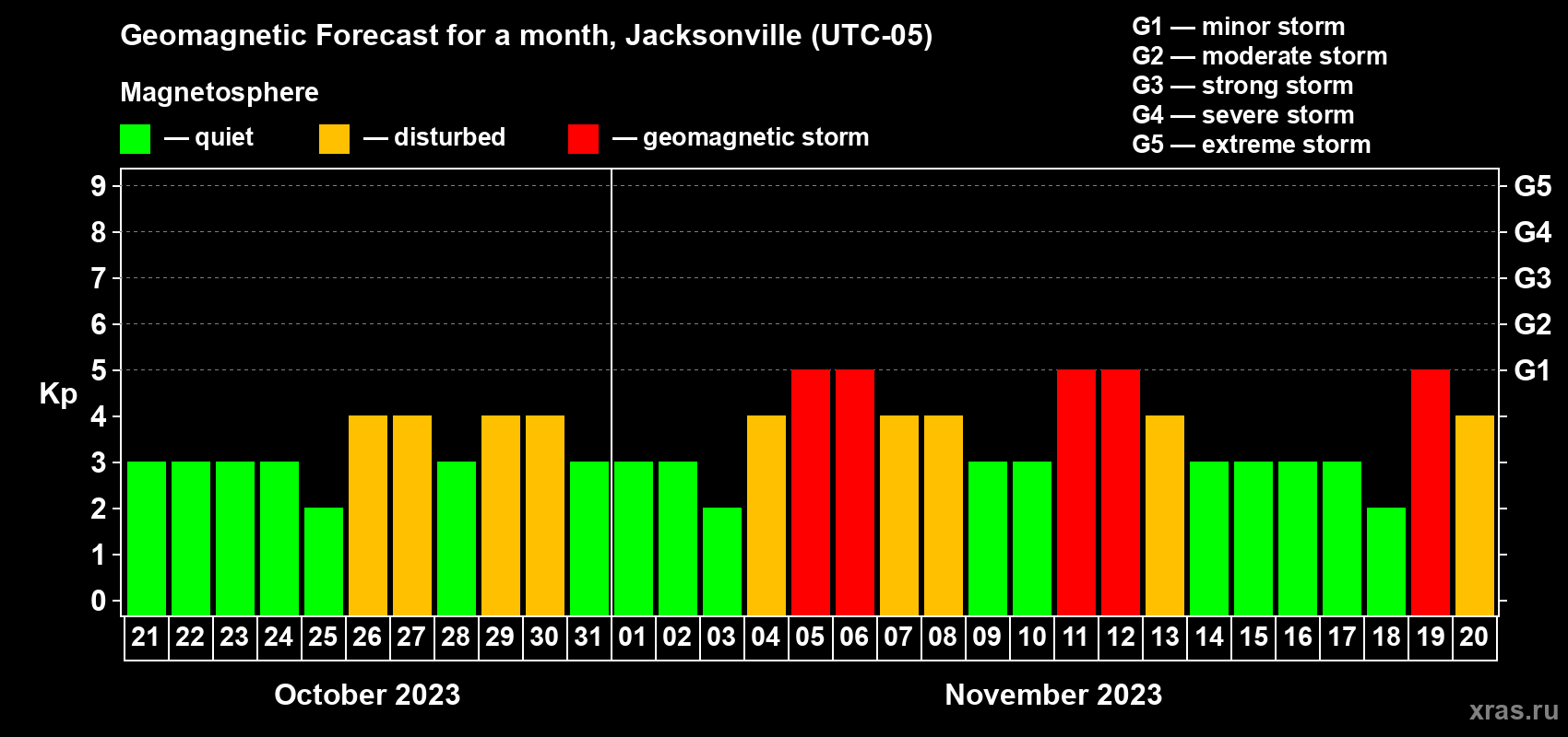 Geomagnetic storm forecast in Jacksonville for Oct 21, 2023