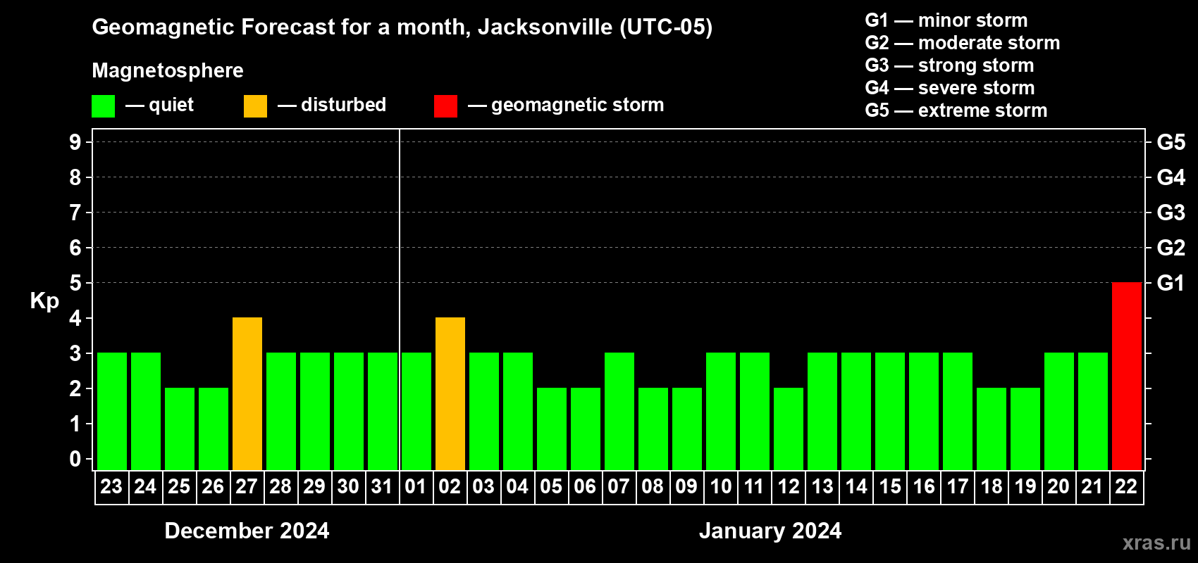 Geomagnetic storm forecast in Jacksonville for Dec 23, 2023