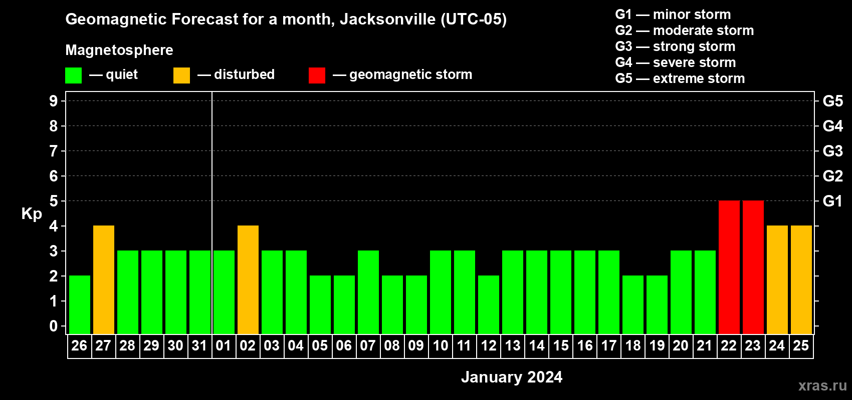 Geomagnetic storm forecast in Jacksonville for Dec 26, 2023