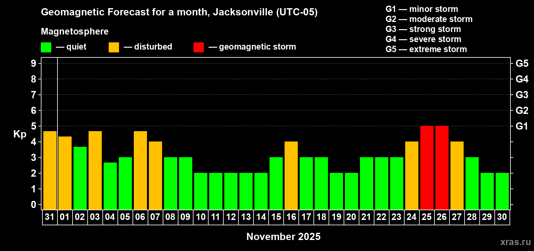 Geomagnetic storm forecast in Jacksonville for Oct 31, 2025