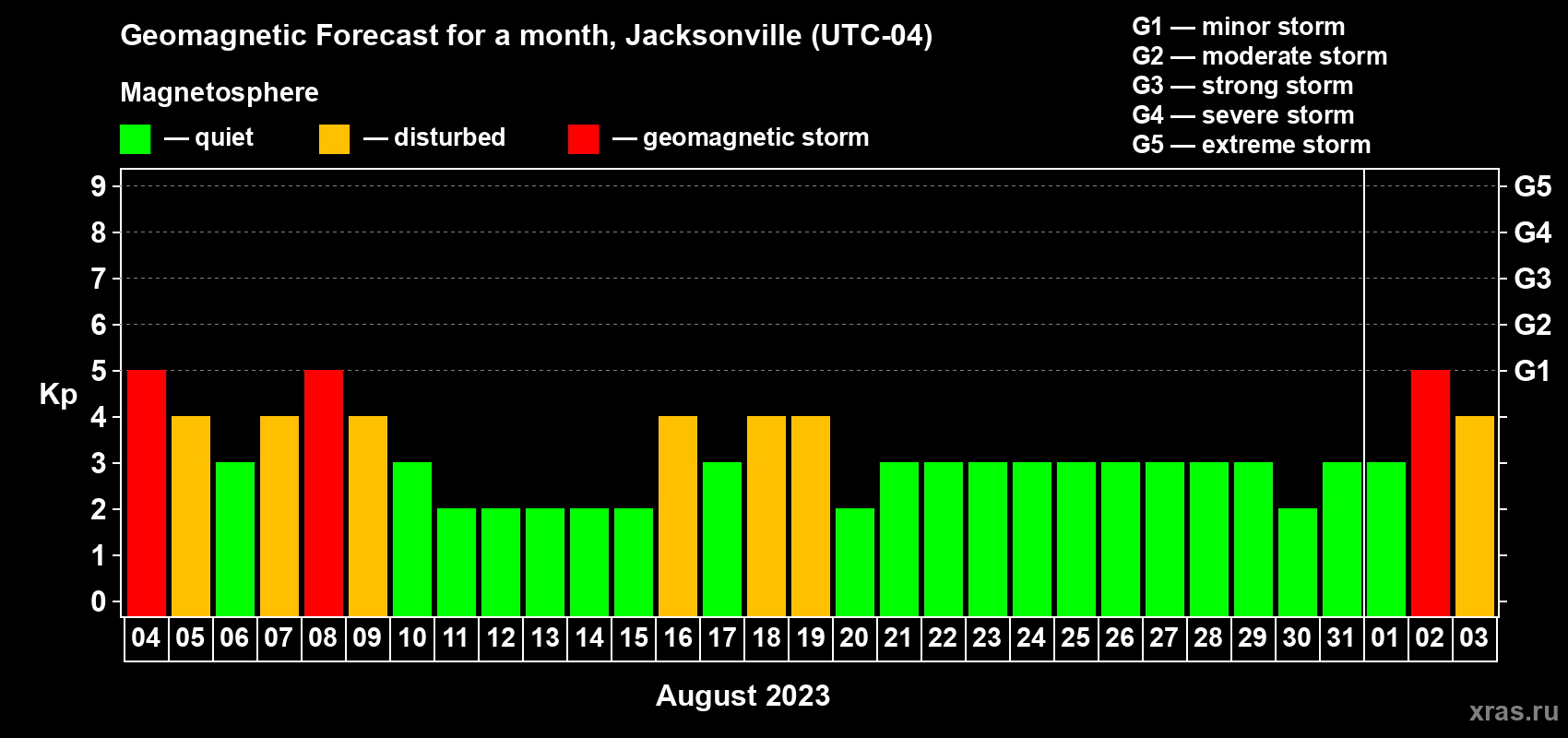 Geomagnetic storm forecast in Jacksonville for Aug 04, 2023
