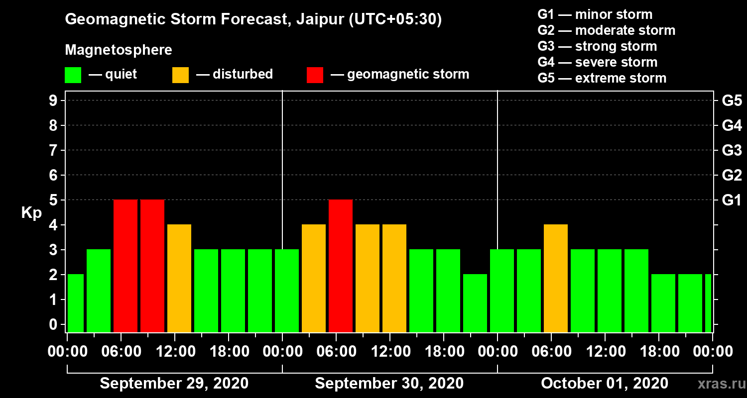 Geomagnetic storm forecast in Jaipur for Sep 29, 2020