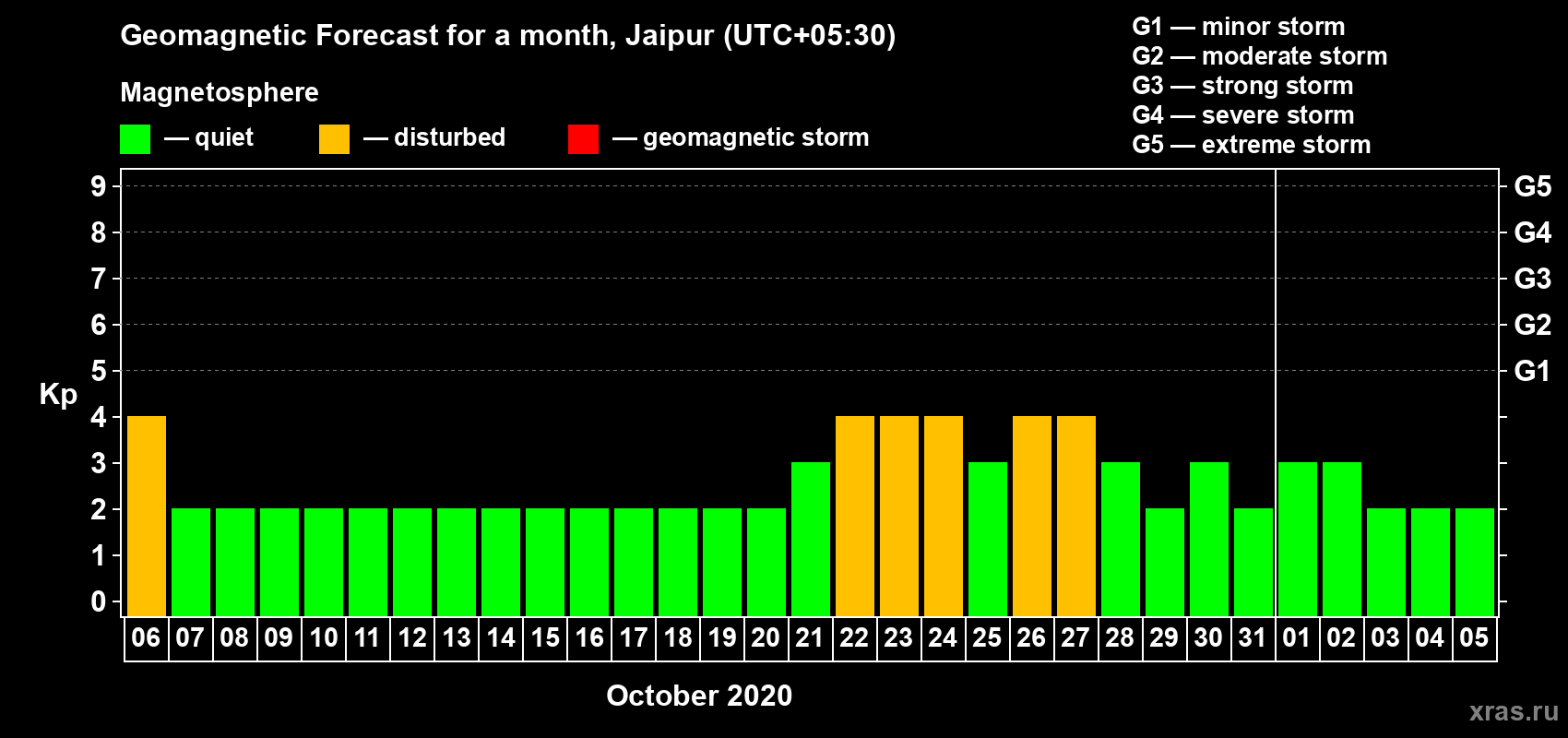 Geomagnetic storm forecast in Jaipur for Oct 06, 2020