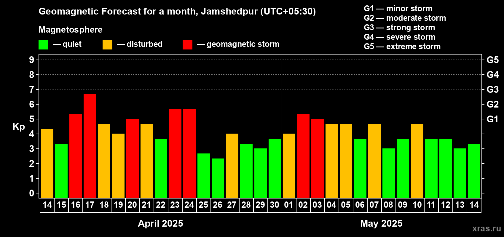 Geomagnetic storm forecast in Jamshedpur for Apr 14, 2025
