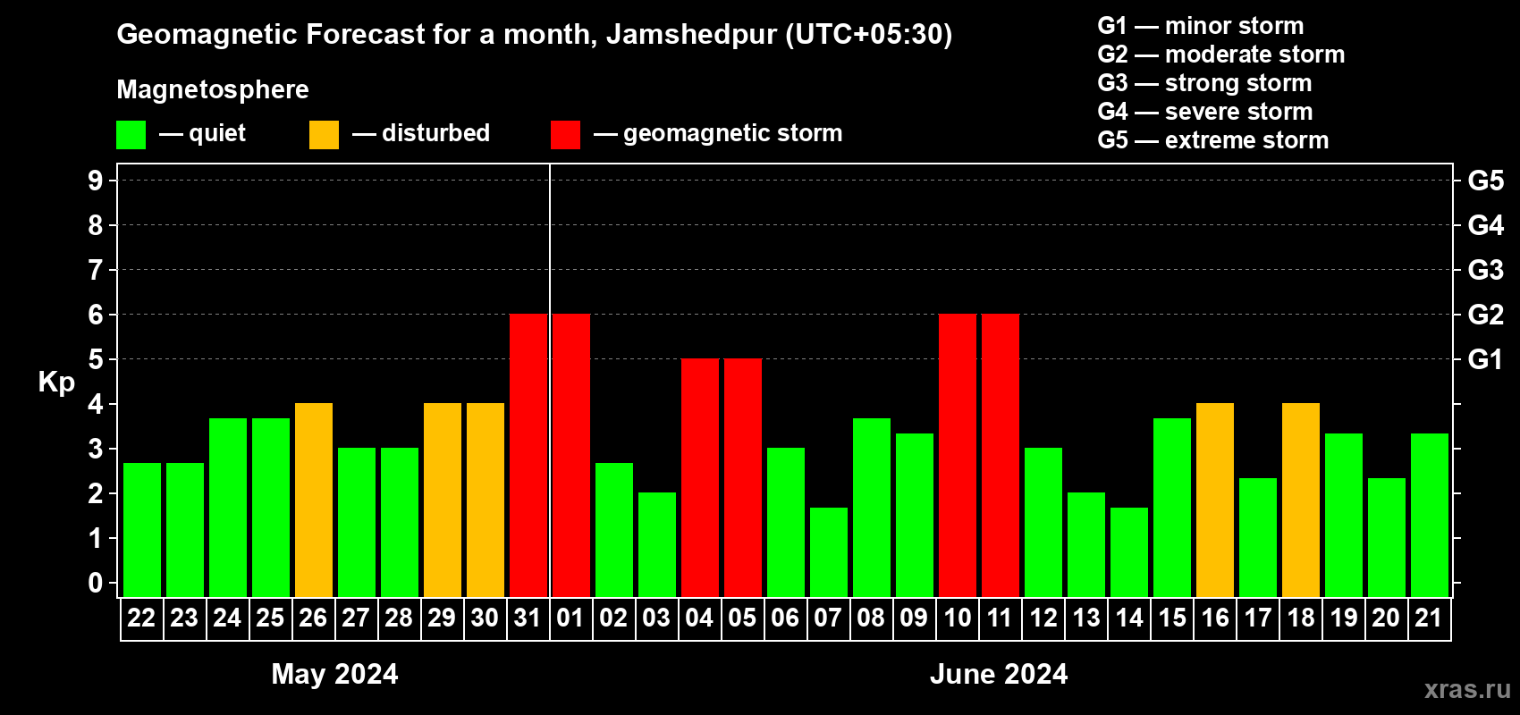 Geomagnetic storm forecast in Jamshedpur for May 22, 2024