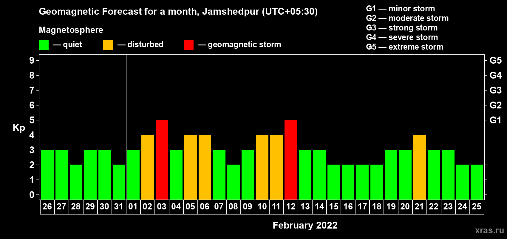 Geomagnetic storm forecast in Jamshedpur for Jan 26, 2022