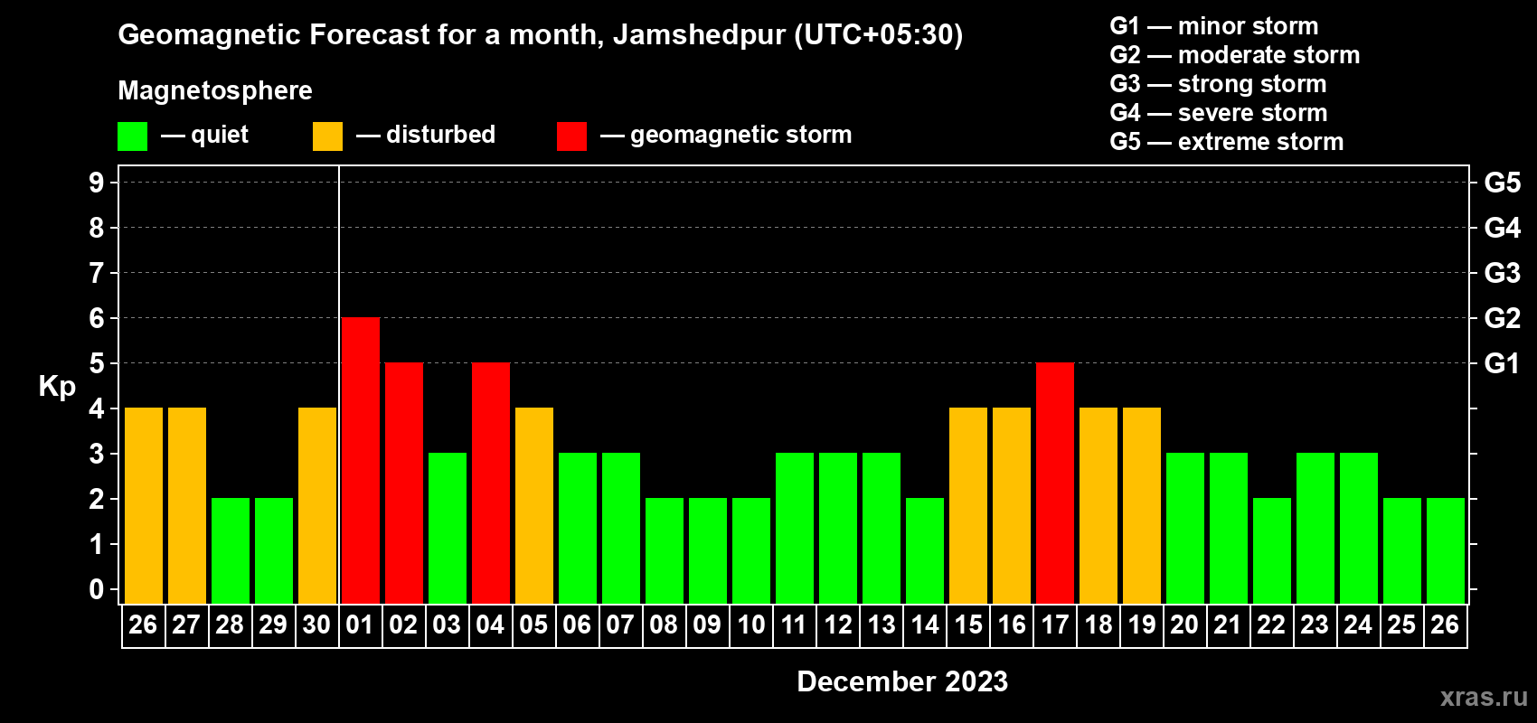 Geomagnetic storm forecast in Jamshedpur for Nov 26, 2023