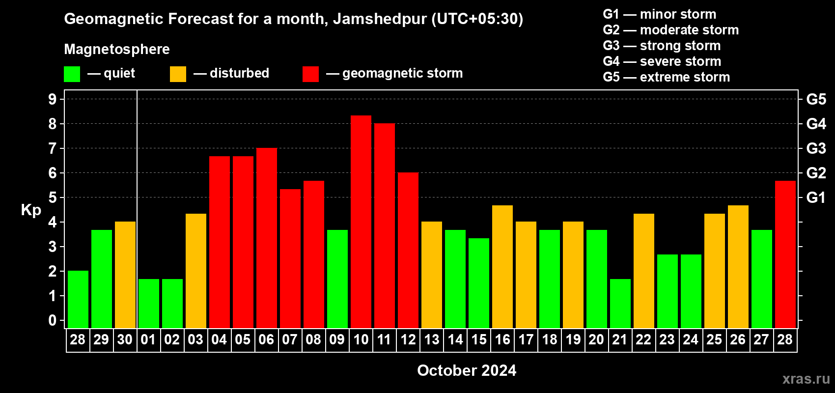 Geomagnetic storm forecast in Jamshedpur for Sep 28, 2024