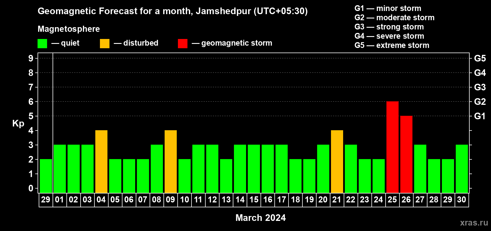 Geomagnetic storm forecast in Jamshedpur for Feb 29, 2024