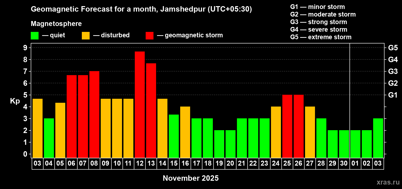 Geomagnetic storm forecast in Jamshedpur for Nov 03, 2025
