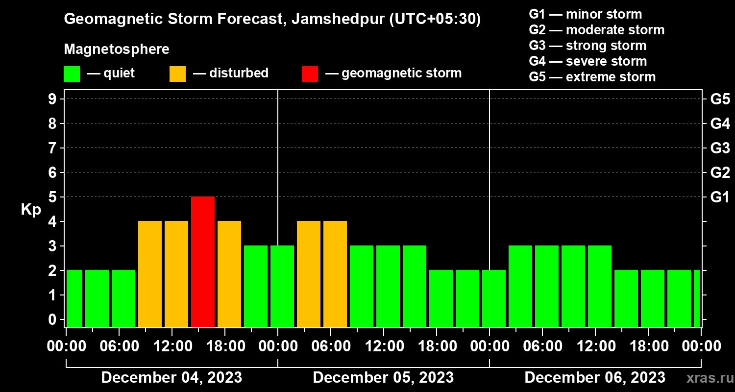 Geomagnetic storm forecast in Jamshedpur for Dec 04, 2023