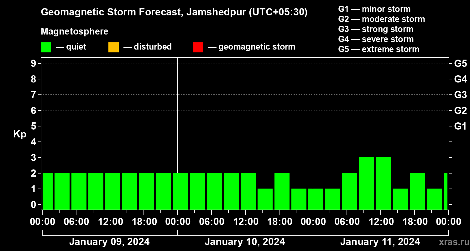 Geomagnetic storm forecast in Jamshedpur for Jan 09, 2024