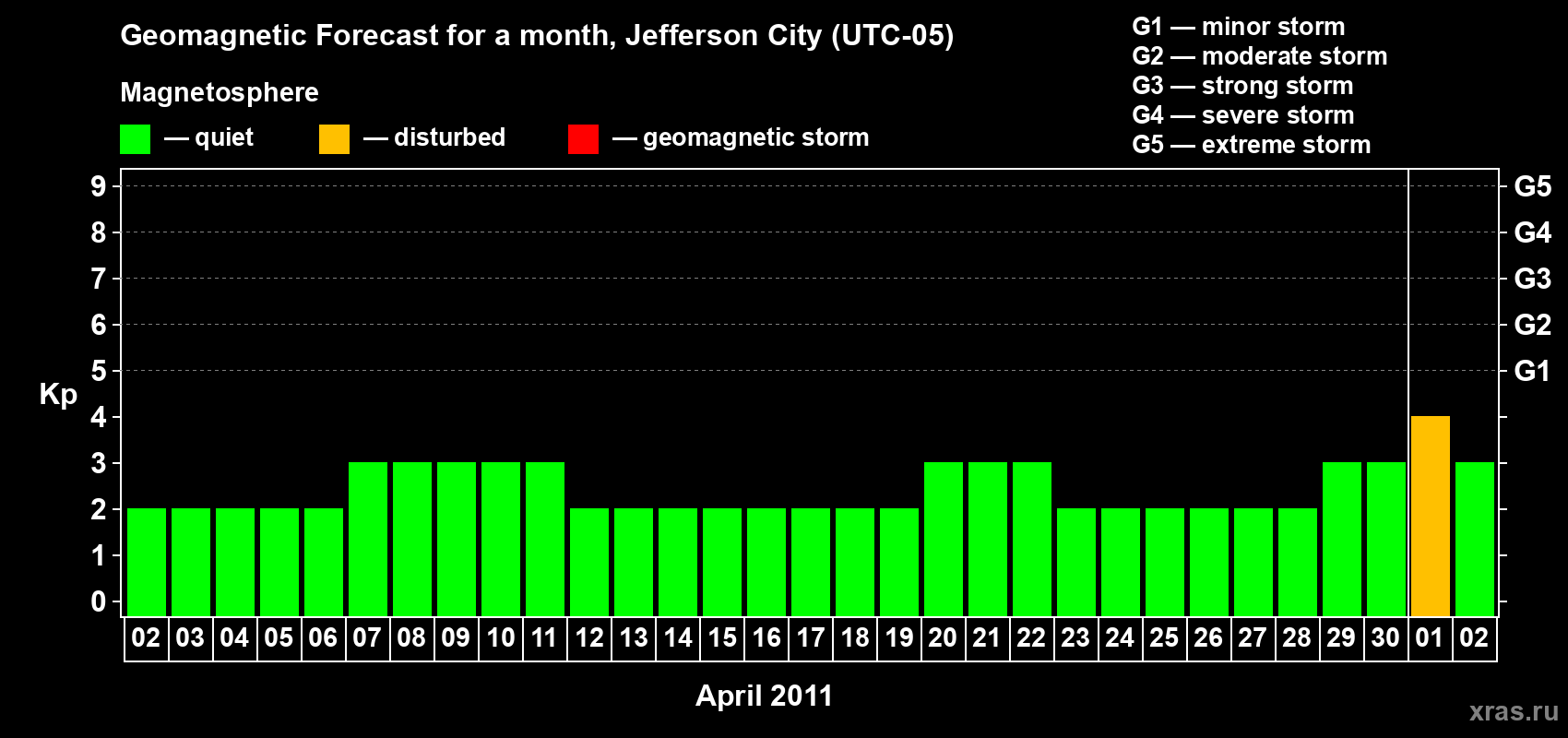 Geomagnetic storm forecast in Jefferson City for Apr 02, 2011