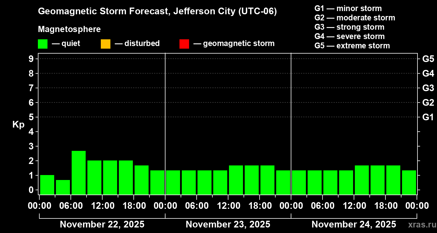Geomagnetic storm forecast in Jefferson City for Nov 22, 2025
