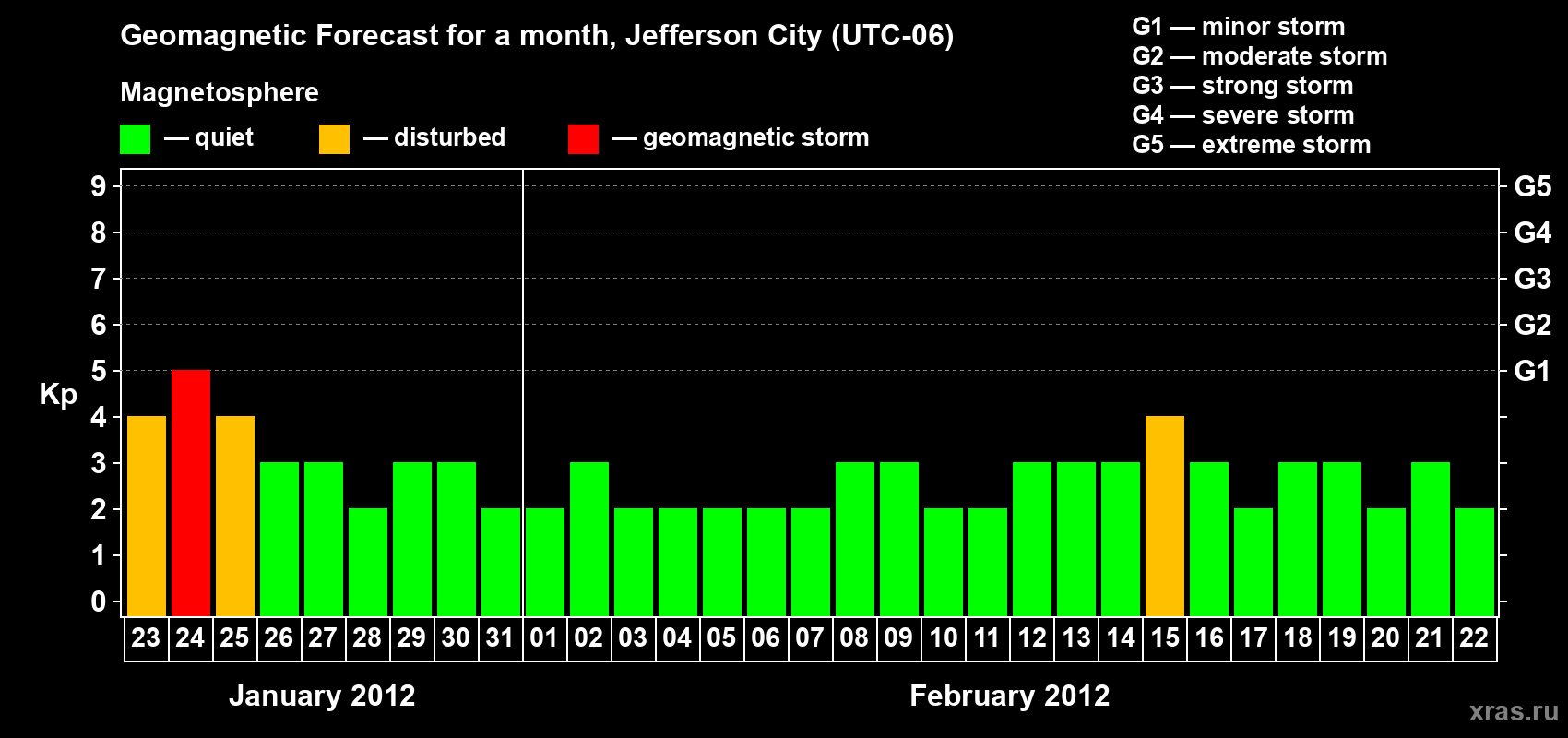 Geomagnetic storm forecast in Jefferson City for Jan 23, 2012
