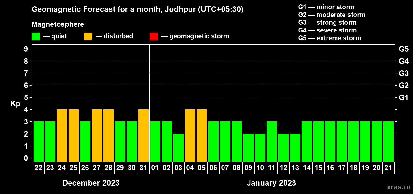 Geomagnetic storm forecast in Jodhpur for Dec 22, 2022