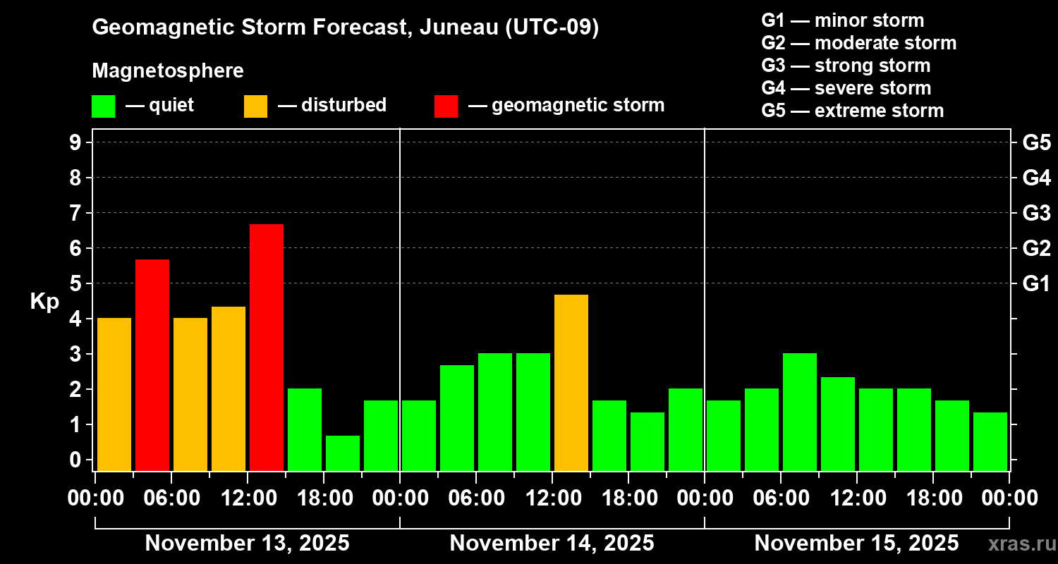 Geomagnetic storm forecast in Juneau for Nov 13, 2025