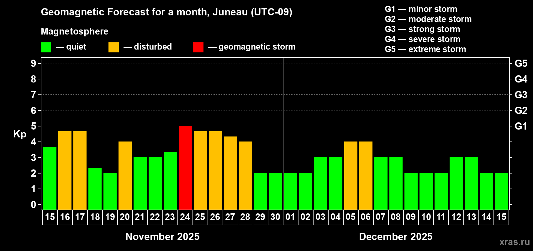 Geomagnetic storm forecast in Juneau for Nov 15, 2025