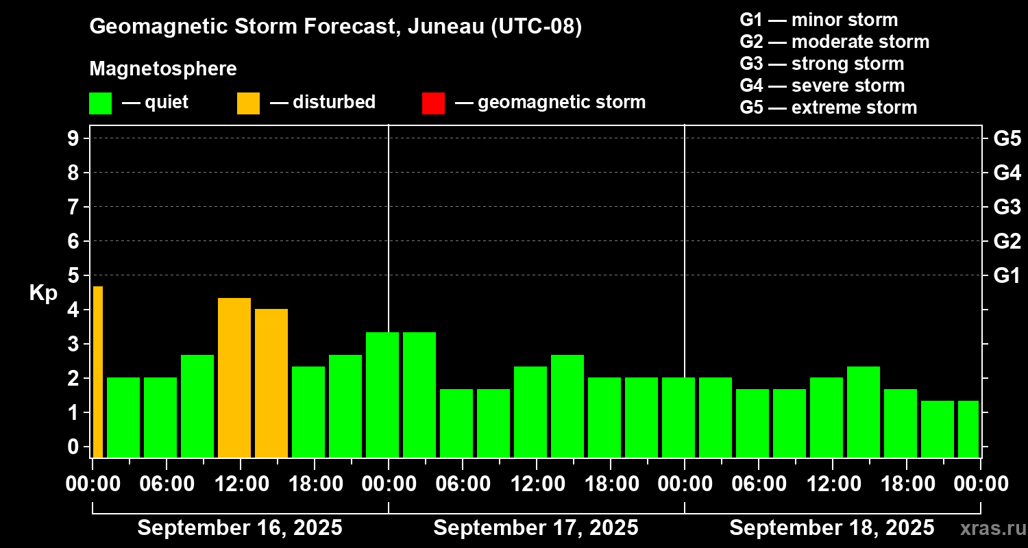 Geomagnetic storm forecast in Juneau for Sep 16, 2025