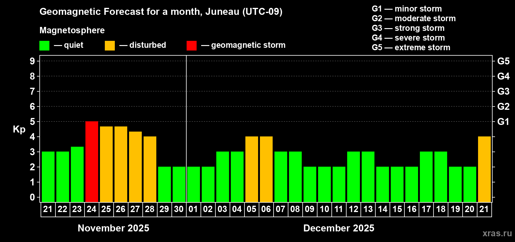 Geomagnetic storm forecast in Juneau for Nov 21, 2025