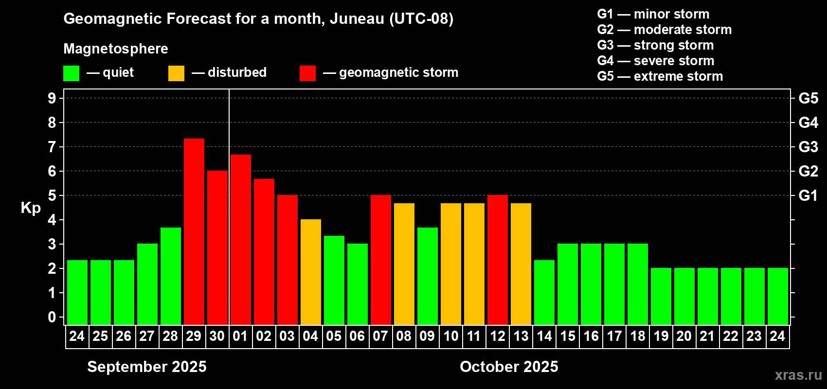 Geomagnetic storm forecast in Juneau for Sep 24, 2025