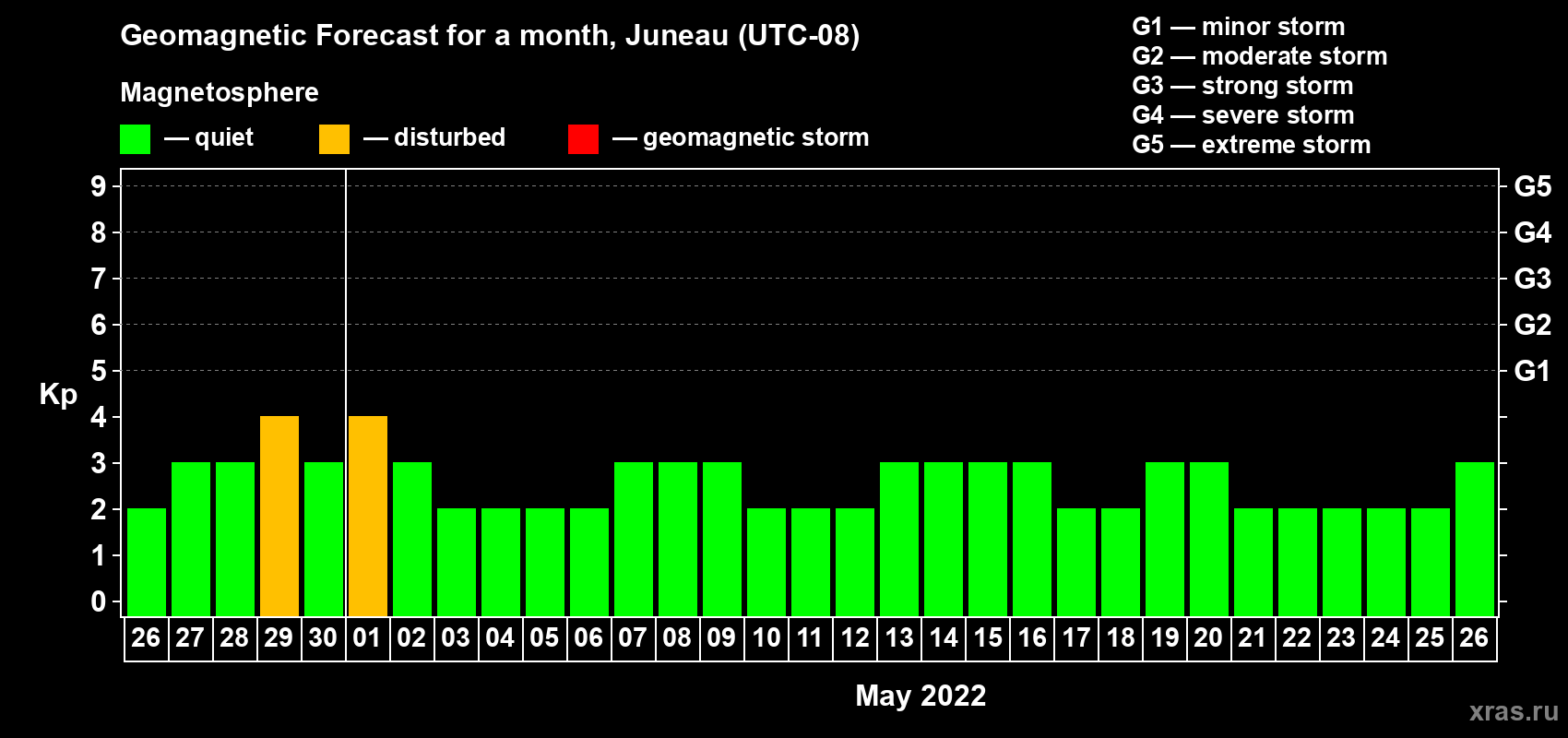 Geomagnetic storm forecast in Juneau for Apr 26, 2022