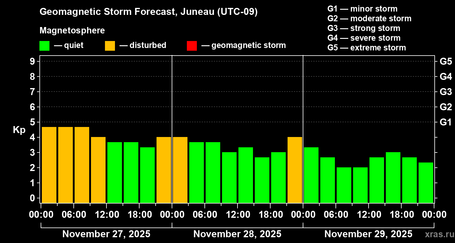 Geomagnetic storm forecast in Juneau for Nov 27, 2025