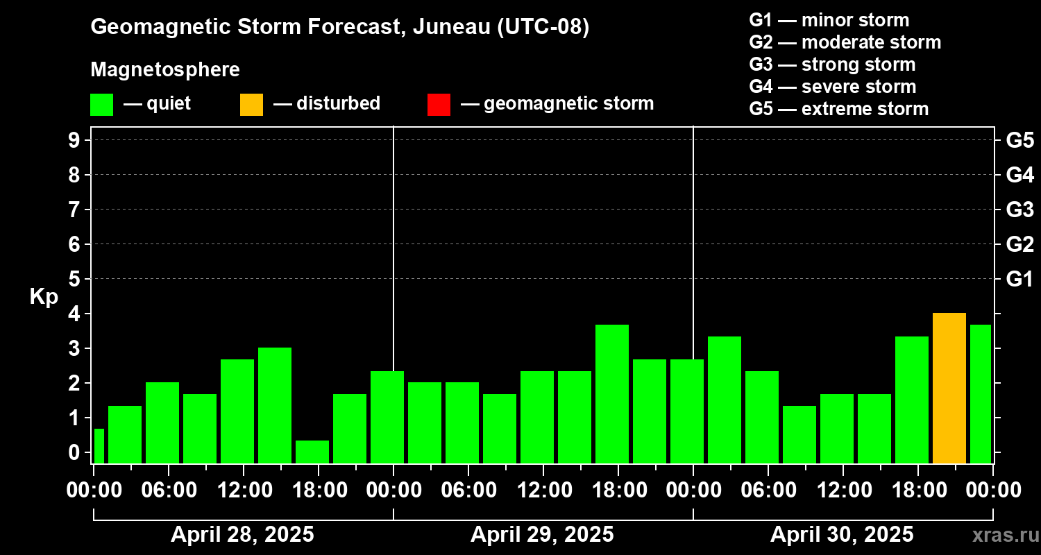 Geomagnetic storm forecast in Juneau for Apr 28, 2025