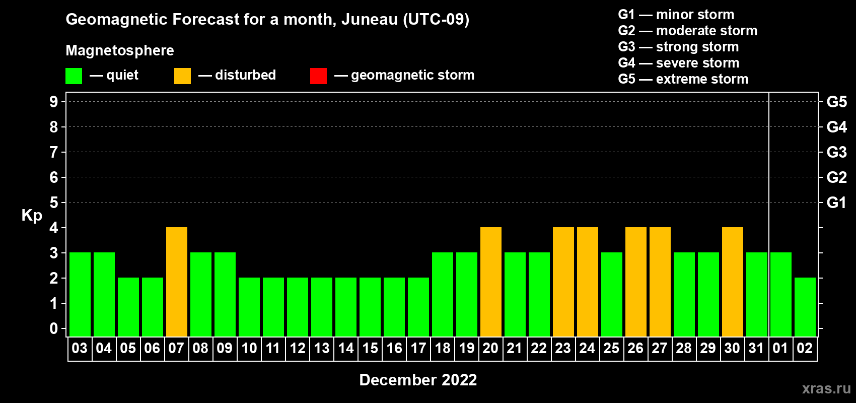 Geomagnetic storm forecast in Juneau for Dec 03, 2022