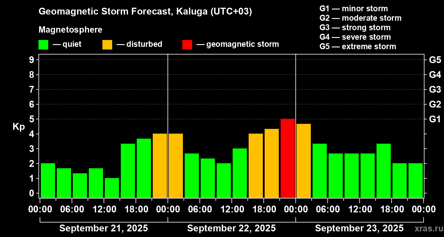 Geomagnetic storm forecast in Kaluga for Sep 21, 2025