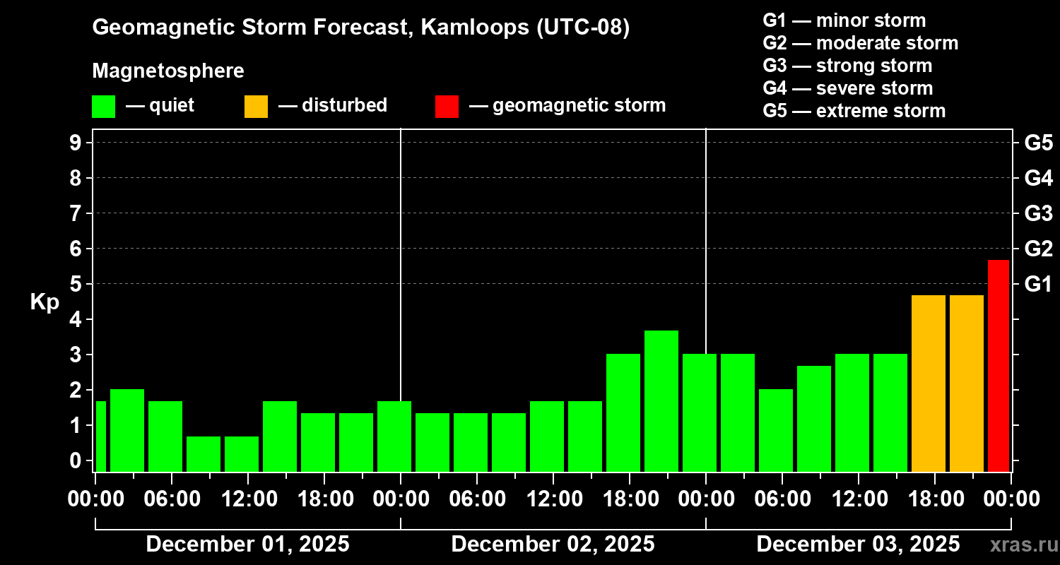 Geomagnetic storm forecast in Kamloops for Dec 01, 2025