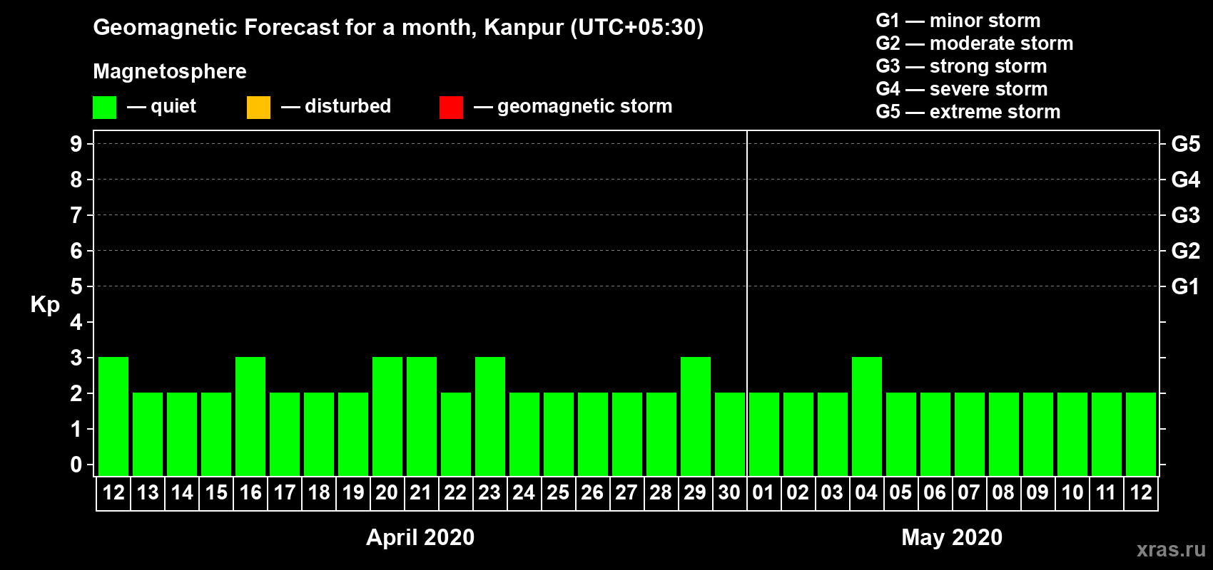 Geomagnetic storm forecast in Kanpur for Apr 12, 2020