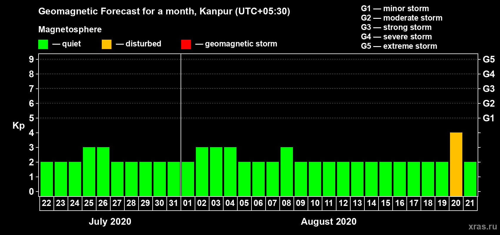 Geomagnetic storm forecast in Kanpur for Jul 22, 2020