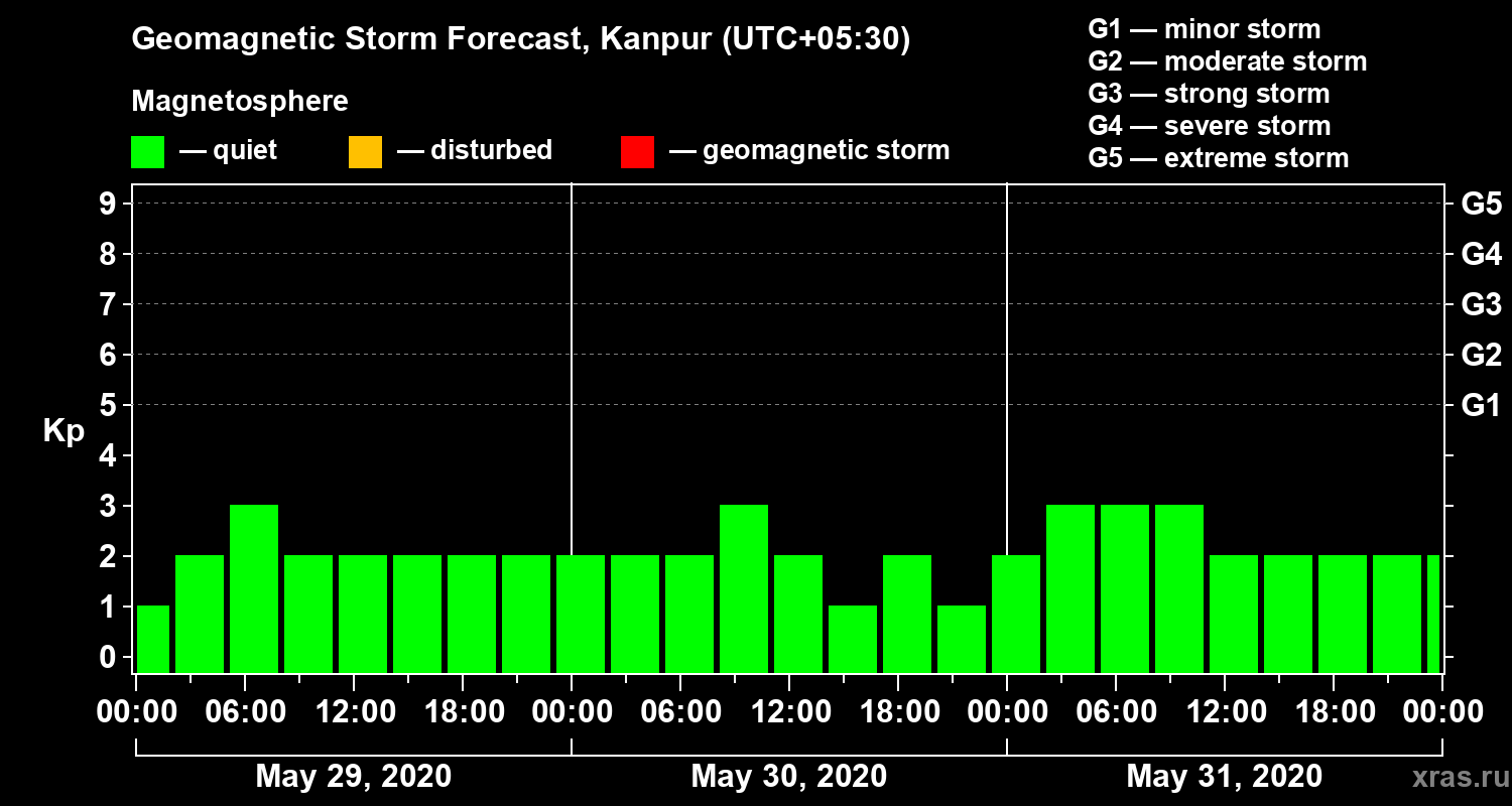 Geomagnetic storm forecast in Kanpur for May 29, 2020