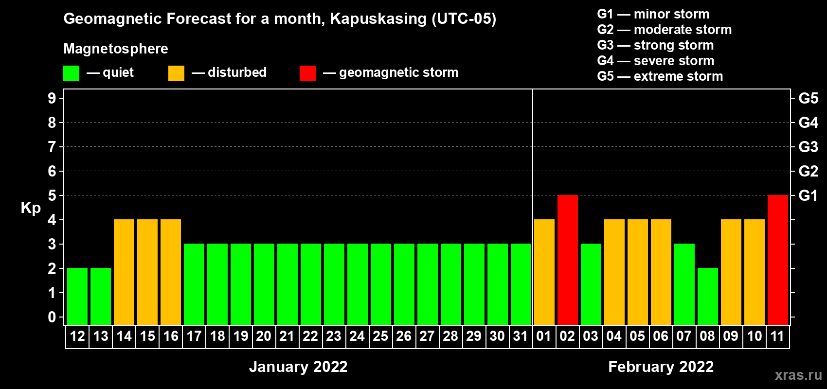 Geomagnetic storm forecast in Kapuskasing for Jan 12, 2022